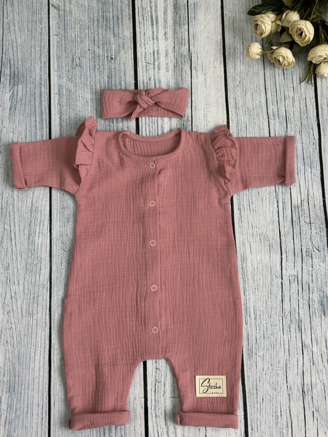 Теги: Купить оптом детский комбинезон . 336-П. Комбинезон с повязкой для девочки из муслина, хлопок 100%, размеры 56,62,68, пудра цена,отзывы официальный сайт "Стеша Орёл"
