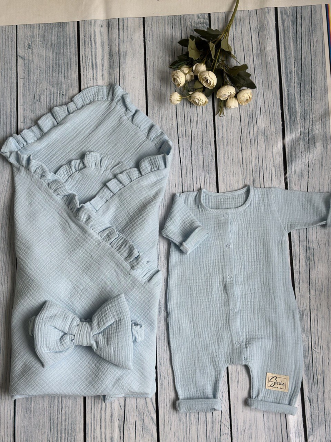 Теги: Купить детские конверты, комбинезон оптом, детские конверты на выписку оптом. 335-Г. Комплект из детского комбинезона, р 56 и конверта муслин, хлопок 100% 90/90 см, голубой цена,отзывы официальный сайт "Стеша Орёл"
