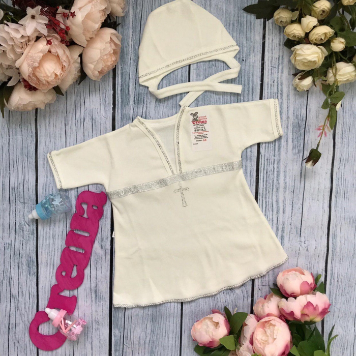 Теги: Купить оптом крестильную рубашку. 169. Крестильная рубашка с чепчиком (серебро), хлопок 100 % интерлок 62,68,74,80 цена,отзывы официальный сайт "Стеша Орёл"
